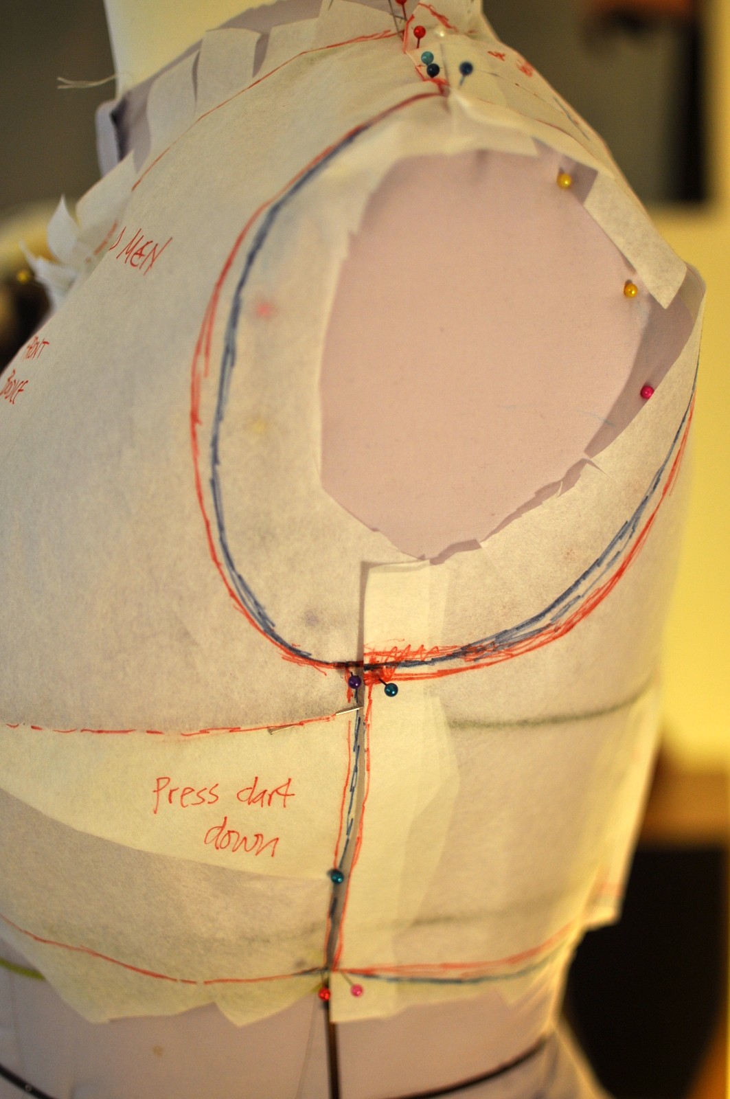 Truing up front and back Published April 15, 2013 at 1063 × 1600 in Truing up front and back Making sure front and back bodice sides and shoulders align. Drawing in the armscye where I think it should be…